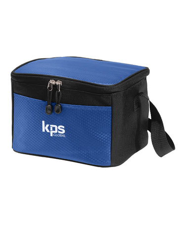 This cooler easily holds six cans as well as an ice pack and other must-haves. 420 denier honeycomb polyester, 600 denier polyester canvas, PEVA lining Adjustable web carrying strap Heat-sealed, water-resistant lining Interior zippered mesh pocket for utensils Large front slip pocket for easy decoration access Dimensions: 6.25"h x 9"w x 7"d; Approx. 393 cubic inches